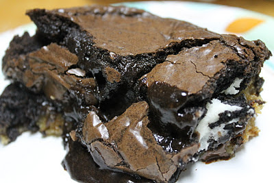 Then you make your brownie mix according to the package directions. I used Dunkin Hines Dark Chocolate brownie mix(I prefer Betty, but couldn't find the flavor I wanted). I then added 1/4 cup chocolate fudge sauce to the brownie mix stirring until it was evenly mixed. Then I poured it over the cookie dough/brownie mixture. I used a rubber spatula to make sure it was evenly spread.